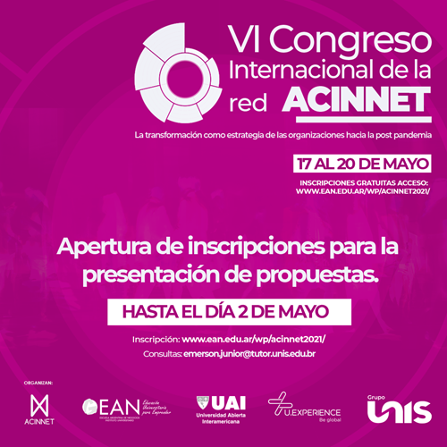 Entre los días 17 y 21 de mayo de 2021, tendrá lugar el VI Congreso de la Red ACINNET, que este año será acompañado en asociación con el VII Congreso Internacional del Grupo Unis y II Conferencia Internacional de U.Experience. El evento también incluye actividades de la IX Semana de Educación a Distancia del Grupo Unis y la II Jornada Interinstitucional Stricto Sensu y Representaciones Sociales.zzz