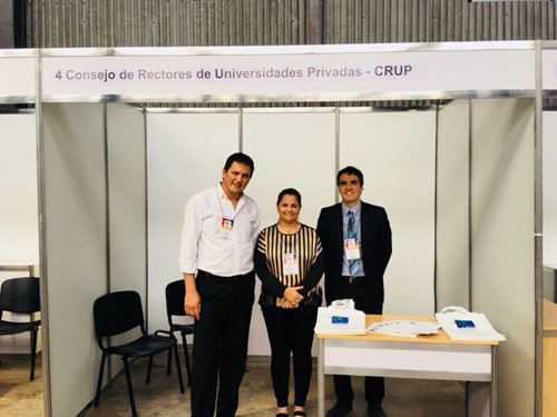Juan Velázquez y Andrea Hassen -Relaciones Internacionales UCU- junto a Ezequiel Mateo Martinich -Departamento de Cooperación Internacional UAI-, en el stand de FIESA 2018, Mendoza, Argentina.”