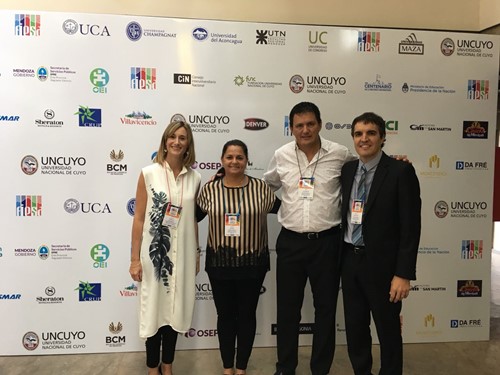 Jimena Estrella de UNCUYO, anfitriona de FIESA 2018 junto a los colegas del CRUP, Andrea Hassen y Juan Velázquez - Relaciones Internacionales UCU- y Ezequiel Mateo Martinich -Departamento de Cooperación Internacional UAI.