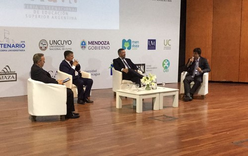 Apertura FIESA 2018. De Der. a Izq.,Cónsul Honoraio de la República Checa, Dn. Fabián Meilán Vicedecano del Cuerpo Consular de Mendoza; Rector de UNCUYO, Ing. Agr. Daniel Ricardo Pizzi; Rector UNNOBA y representante del CIN, Dr. Guillermo Tamarit y Rector UAI y Vicepresidente del CRUP, Dr. Rodolfo N. De Vincenzi.
