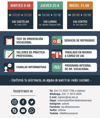 Sabemos lo importante que es la elección de una carrera universitaria, por ello durante el mes de agosto la Universidad abrirá sus puertas para la realización de sus jornadas Educativas ¨Open Day¨. Si estas en el último año del secundario, te invitamos a conocer nuestras instalaciones, dialogar con los Decanos, Directores y participar activamente de los talleres para que te acerquen a tu profesión preferida. Además, podrás realizar un Test de Orientación Vocacional para reducir el margen de tu elección.