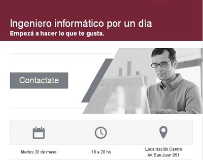 Si te interesa conocer más sobre el tema, te invitamos a participar en ingeniero informático por un día, un taller totalmente práctico que te permitirá entender qué actividades realiza un informático: desde desarrollar programas sobre plataformas web hasta interrelacionarte y programar robots físicos en nuestros laboratorios. Asimismo, tendrás la oportunidad de vincularte personalmente con profesionales que te ayudarán a comprender el maravilloso mundo de la tecnología y acompañarte en esta experiencia que te permitirá confrontar tu vocación con las actividades que realiza un ingeniero informático, pudiendo así decidir tu futuro profesional.