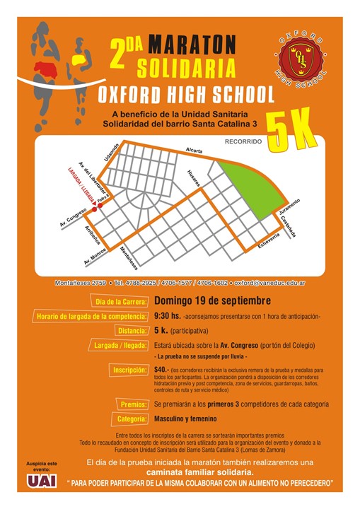 Colegio Oxford invita a participar de la 2da Maratón solidaria. El evento será el día domingo 19 de septiembre a partir de las 9.30 hs. La largada será sobre la Av. Congreso, en la puerta de la Institución.
