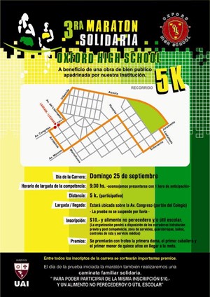 El domingo 25 de septiembre, a las 9:30, se realizará la 3ra Maratón Solidaria Oxford High School, a beneficio de una obra de bien público apadrinada por el Colegio, que se encuentra en Montañeses 2759. La inscripción es de $10 más un alimento no perecedero y/o útil escolar.