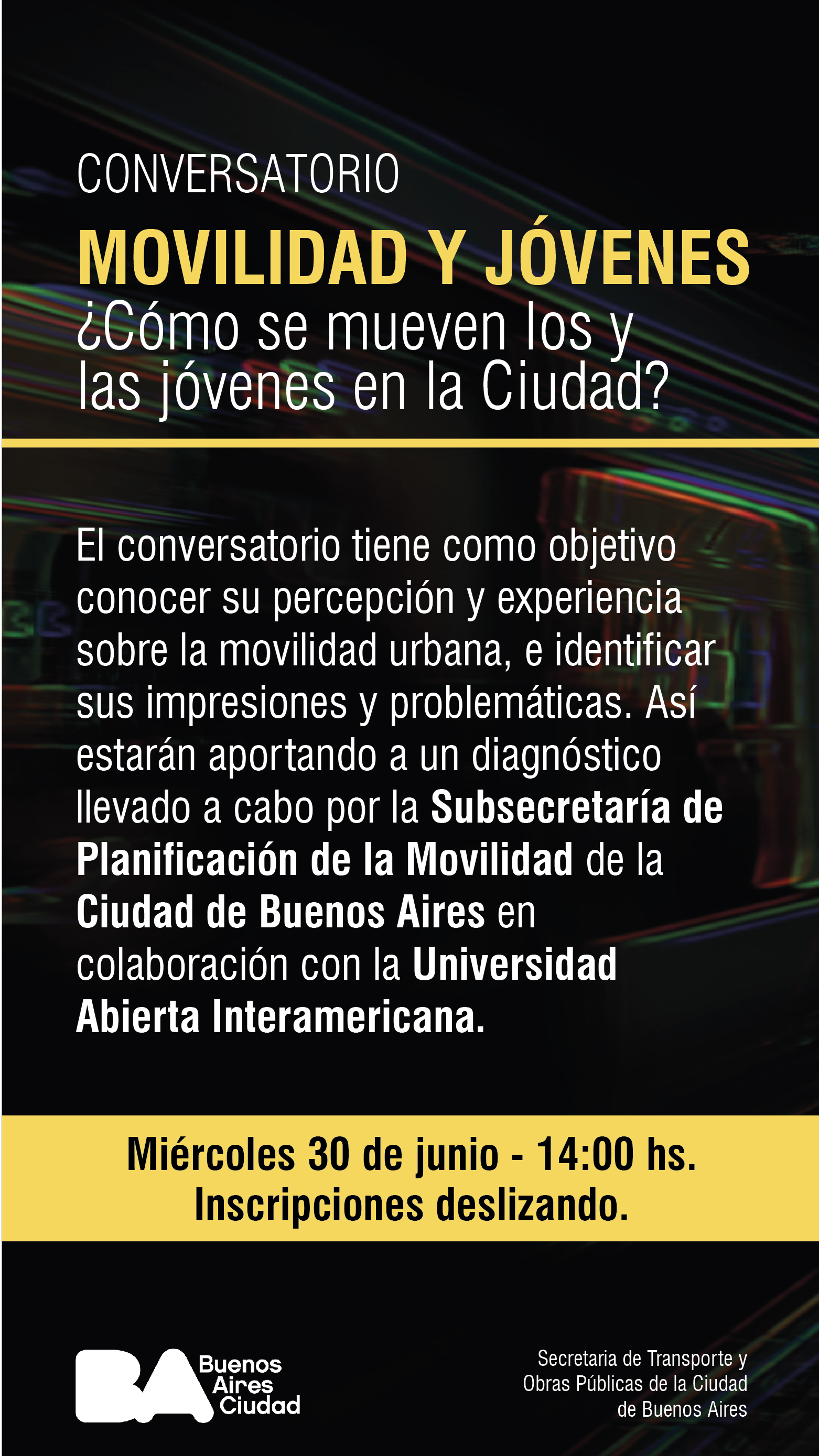 Ya está abierta la inscripción para el Conversatorio virtual "Movilidad y jóvenes ¿Cómo se mueven los y las jóvenes en la Ciudad?", que se llevará a cabo el próximo miércoles 30 de junio a las 14 horas.