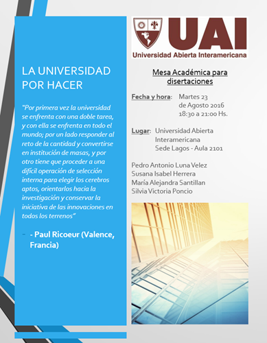 El próximo martes 23 de agosto a las 18:30 hs en la Sede Lagos de la Universidad Abierta Interamericana, ubicada en O. Lagos 944, Aula 2101, tendrá lugar la actividad de extensión denominada: “LA UNIVERSIDAD POR HACER”.