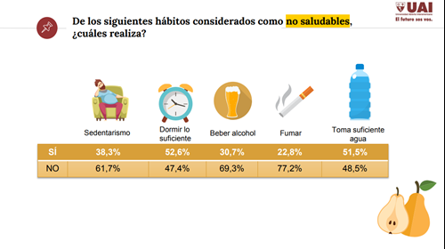 Por último, los encuestados contestaron sobre hábitos poco saludables como el sedentarismo (38,3% dijo que lo sufre), no dormir lo suficiente (47,4%), tomar alcohol (30,7%), fumar (22,8%) y no tomar suficiente agua (48,5%).