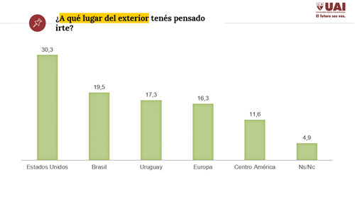 De aquellos que contestaron que sí se irán de vacaciones, el 64% lo hará en Argentina y el resto en el exterior. Dentro del país, el destino más elegido fue la Costa Atlántica (45,8%) y el Sur (18,9%). De los que aseguraron que pueden dejar el país para vacacionar, Estados Unidos (30,3%) fue la respuesta mayoritaria, seguido de Brasil (19,5%), Uruguay (17,3%), Europa (16,3%) y Centro América (16,3%).
