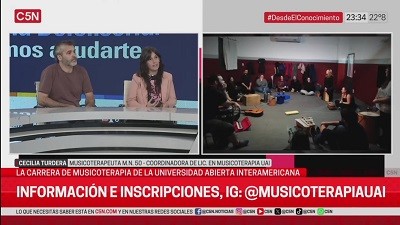 La Lic. Cecilia Turdera, directora de la Licenciatura en Musicoterapia de la Sede Buenos Aires de la UAI, junto al Lic. Maximiliano Papa, docente de la carrera y titular del Seminario de Integración Práctica, fueron invitados al programa "Desde el Conocimiento" en el canal C5N, donde reflexionaron acerca de todo lo que rodea a la Musicoterapia.