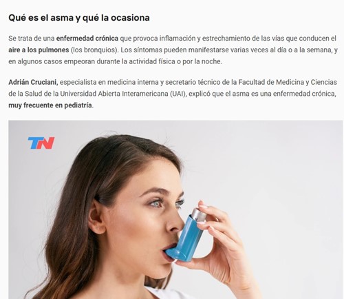 El artículo, titulado "Las personas con asma tienen más riesgo de desarrollar obesidad", informó que el asma afecta a casi 340 millones de personas en todo el mundo y a 4 millones de argentinos, aunque la mitad no lo sabe. Es la enfermedad respiratoria no transmisible más frecuente en niños y adultos. Ahora, científicos creen que las personas que lo padecen tienen un 21% más de riesgo de desarrollar obesidad.