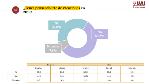 Uno de los datos sobresalientes de esta encuesta, es que para el verano 2019 un 55,3% de las personas ya tienen decidido que no se irán de vacaciones. Anteriormente esa cifra fue de 46,5%. 700 residentes en CABA fueron las personas que participaron de dicho relevamiento.