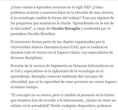 En esta ocasión fue por la charla que brindó Nicolás Battaglia, docente de Ingeniería en Sistemas Informáticos de la UAI, en el Espacio Clarín.